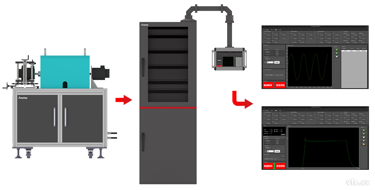 伺服試驗平臺和綜合測試柜之間通過(guò)標準接口連線(xiàn),連線(xiàn)清晰明了、簡(jiǎn)單方便。
